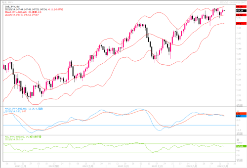 周三(9月13日),美元兑日元上涨0.27%,报147.45,日元继续回吐周一的大幅涨幅。隔夜美国8月份总体通胀率仍显增长,令美债收益率继续保持攀升的势头。近期10、20年期美债收益率分别逼近4.26%、4.53%高位,进一步碾压日元债券收益率。而日本央行至今迟迟在利率上保持超级宽松,货币政策上仍无所作为的表现,更是直接给到日元压力而不断走贬。美元/日元尽管担心日本央行的潜在干预措施,但正在缓慢走高。日线级别图上,最近的有效阻力位位于148.00 – 149.00范围内。美元/日元将需要更大的催化剂才有可能推动美元尝试朝149-150价格区域逼近。但纯从技术指标来看,顶背离迹象逐渐明显,要时刻警惕防范变盘的发生。