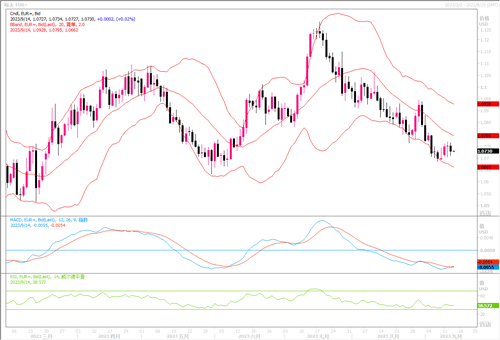 周三(9月13日),欧元兑美元下跌0.22%至1.0730。美国劳工部的数据显示,由于汽油价格急升,上个月消费者物价指数(CPI)增长0.6%,为2022年6月以来的最大增幅。剔除波动较大的食品和能源部分,核心CPI增长0.3%,增幅因二手车和卡车价格下降而有所放缓。该数据未能影响美联储将在下周9月19-20日会议结束时宣布维持利率不变的观点。但是对于11月份会否继续加息,市场上的预测意见产生分歧。也就是说还不能排除年内美联储将再加息一次的可能性。为此,美元指数周三仍然保持在近期的高位区域。日内,欧央行将召开利率会议,如果欧央行维持利率不动,那么势必降低今后继续加息的押注,欧元将会遭到冲击。相反若欧央行加息25个基点,则欧元/美元或能得到一定的抬捧出现反弹性的上升。日线图上,纯从各类技术指标来看,似有底背离产生的痕迹,MACD信号线有形成金叉的迹象。要提放短线超卖调整反弹的风险。就整体而言,欧元/美元仍处在布林带中轨之下,维持着完好的下降通道形态。