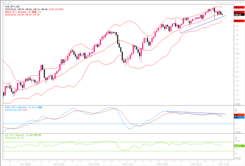周一(10月9日),美元兑日元下跌了0.57%,至148.49。因中东局势令市场恐慌,作为传统避险货币的日元在交叉盘中受到追捧,从而也间接提升了其兑美元直盘的报价。加之,尽管美国非农就业数据虽然强劲,但尚不足以改变预期美联储11月份维持息口不动的预期。因此,投资者似乎开始找到缓解日元贬值压力的借口。美元/日元很可能会在获利盘的抛压之下出现调整性回落的走势趋向。日线图上,顶背离迹象似乎在逐渐得以印证,价格线也开始有坠落布林带通道中轨线之下的趋向,技术指标趋向下摆。下方密切留意147.50的的支撑,若跌破,要小心调整性回落势头恐将美元/日元拖低至更低的水位。