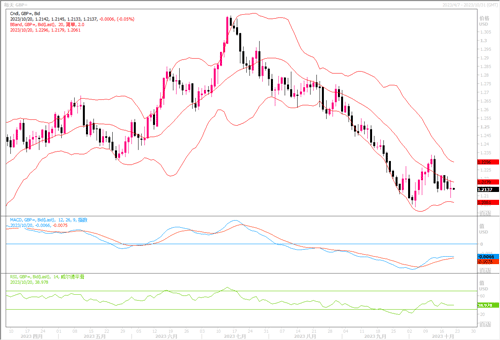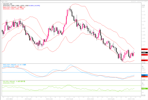 周四(10月19日),美元周四下跌,欧元/美元则稳中有升,当日收高0.4%至1.0579,盘中最高一度曾触碰1.0616水位。美联储主席鲍威尔在一个经济论坛上做出的发言,他表示,美国经济强劲和劳动力市场持续吃紧可能为进一步加息提供理由。但他也指出,近期市场推动的债券收益率上升已帮助“显着”收紧了整体金融状况。他的这番讲话,被市场认为略微偏向鸽派。市场预计美联储将在可预见的未来将把利率维持在当前水平。根据芝商所的FedWatch工具,联邦基金利率期货暗示美联储在12月加息的可能性为30%,低于鲍威尔发言前的39%,11月加息的可能性为零。为此,当日美债收益率自16年来的高点回落,美元也做出了后撤的行情表现。日线图上,欧元/美元仍旧紧守1.05水平之上,当上方靠近布林带上轨线的1.0650水平构成了比较重的压力,若能突破,则有望看到欧元进入反弹回升的行情节奏。