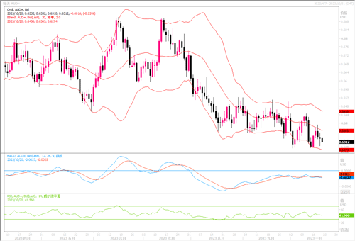 周四(10月19日),澳元兑美元下跌0.3%至0.6317美元,上一交易日从0.6394美元高点回落。目前主要支撑位在0.6287美元附近。澳洲周四也出现类似情况,数据显示9月就业人数仅增加了6,700人,分析师原本预计就业增加20,000甚至更多。失业率进一步降至3.6%,但主要原因是更多人放弃找工作。这样的结果本身可能不足以抵消澳洲央行对通胀的担忧。澳洲央行近期的鹰派言辞增加了11月加息的可能,而下周通胀数据将提供关键证据。澳洲第三季消费者物价指数将于10月25日公布,有分析师认为核心通胀率上升幅度有可能超过澳洲央行自己预测的0.9%。若通胀率最终显示继续上升,将提高澳联储继续升息的预期,届时澳元或会从中获得一定的抬振。日线图上,澳元/美元依旧运行在布林带下轨之中,未能摆脱偏弱走势趋向。年内低点0.6286是关键的支撑, 若跌破,目标指向2022年趋势低点0.6107。若能守住,则有望构成双底形态,从而看看能不能展开反弹修复的行情。