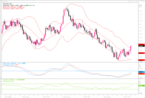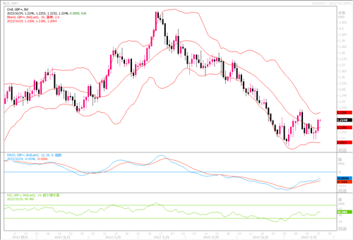 周一(10月23日),美元兑一篮子货币周一下跌,欧元/美元当天上涨了0.73%,高收盘在1.0668。周一美国指标10年期债券收益率在短暂升穿5.0%后回落。自7月中以来,美国公债收益率飙升,提升了美元相对于其他货币的吸引力,并帮助美元指数上涨超过6%,但该指数自10月初以来几乎没有取得进展。这不得不引起投资者深思,考虑美国长端债收益率的驻足不前,是否意味着本轮加息周期进入尾声。本周有大量数据公布,周四将公布美国GDP数据,此外还有加拿大央行(BOC)和欧洲央行(ECB)的会议。交易员都在密切关注上述的重要数据和事件。路透调查显示,虽然欧洲央行已经完成了加息,但至少要到2024年7月才有可能开始放宽政策。因此欧美央行都可能按兵不动的情势下,美元的多头仓位或许会遭到一定程度的出清。目前日线图上,欧元/美元隔夜市场上冲破了前期重阻力水平1.0650后挺进至布林带通道上轨方,技术指标配合性的上扬,显示欧元在抄底盘的推动之下上冲动能有所增强。上方进一步攻击目标有望瞄向1.08附近。而下方1.05-1.0530区域成为了较强的支撑所在。