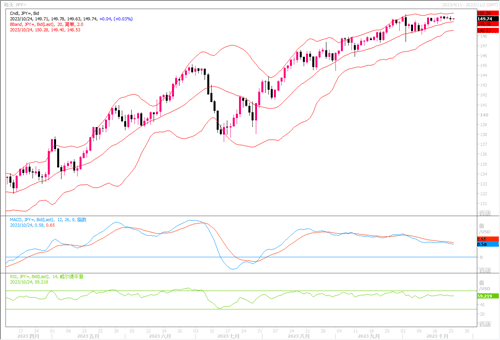 周一(10月23),美元兑日元继续停留在149.90水平附近。现在两方力量在较劲之中,一方开始押注日本央行将会有干预动作,一方则押注认为美国公债收益率仍有继续上升空间。而就日本的利率政策走向来说,据路透周一报导,近日全球利率攀升,令日本央行面临更大压力在下周调整债券收益率控制,目前正在讨论有可能上调三个月前刚设定的现有上限。若本月底日本央行会议上在收益率曲线控制方面有进一步放宽上限的动作,势必提高市场认为日本央行有望结束负利率时代的预期,届时受此影响,日元恐怕将会迎来反弹回升的机会。日线图上,美元/日元继续在高位区域小幅踱步之中,布林带喇叭口极度缩窄。须留意变盘时刻的到来。上方若冲破150,美元/日元将继续走高一线。而一旦跌穿布林带中轨线所在149水平,则小心留意美元/日元开始走逆向的风险。