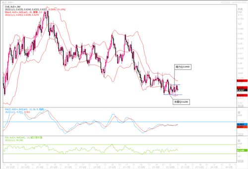 周二(10月31日),澳元兑美元下跌0.4%至0.6346。周二日本央行表示,将1.0%作为日本10年期公债收益率的参考,而非上限,从而使收益率曲线控制(YCC)政策更加灵活。这些举措被视为向政策紧缩迈出的又一步,但力度不如有些人预料的那样大,引发了美元兑日元的空头回补的升势。为此,澳元与其他一干非美货币也受连累出现回落行情。但就澳洲本身而言,澳洲央行仍面临着进一步收紧的压力,因为通胀率居高不下,且消费者表现比政策制定者预计的更具韧性。市场目前暗示,澳洲央行在11月7日将4.1%的指标利率上调25个基点的可能性约为60%,这将有可能结束四个月来的稳定决策。在澳元利率有可能再度被调升的预期加持之下,料澳元当前尚不至于陷于大幅走溃的境地。日内还需密切留意美联储10月份利率会议将会释放出何种信息。近期澳元/美元走势大概率仍偏向于在近期的低位区间(0.62-0.64之间)横盘震荡。