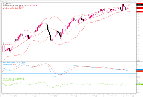 周四(11月9日),美元兑日元上涨0.21%,触及11月1日以来最高的151.29。美联储主席鲍威尔在周四的发言中表示,决策者“没有信心”认为利率已经高到足以结束通胀阻击战。而就在鲍威尔发言之前,美国30年期公债标售疲软,标售不佳推动各年期公债收益率攀升。两件事件在当日提振美元继续回升。本周以来,包括美联储主席鲍威尔在内的不少美联储官员,在货币正政策上的发言都没有软化的口吻。美联储也是乐见在当下高利率水平下,通胀能够逐步回落,而经济又能继续维持增长的软着陆局面。目前来看,全球范围内,也似乎仅美国能取得如此效果。因此,即便利率期货市场押注美元进一步升息概率较低,而美联储若维持当前超过5%的基准利率水平相当长时日,想必对美元也是能援以较好的支撑。利差上的优势,恐怕会令套利交易继续冒险推升美元/日元去探测日本政府所能容忍的红线水平在哪里。近期上方须继续密切留意年内高点151.74和去年高点151.94的阻力情况,若被刺穿而又未招致日本央行的入市干预,那么美元/日元将有望往更高水平推进。相反,若日本央行在上述水平有实际的市场干预行动,那则或许能证明上述水平是日本政府倾力扞卫的底线,进而须谨慎防范美元/日元回落的风险。当前下方的初步支撑在150.00-149.40区域。