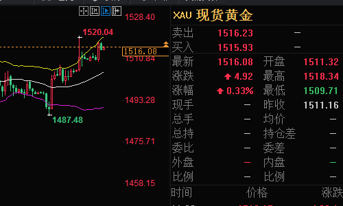 黄金:周一黄金开盘在1497.38美元,白盘黄金走出一波下跌,最低下跌至1487.52美元,欧盘阶段黄金反弹20美金,金价重新来到1505上方,美盘后半夜黄金再创新高,最高上涨至1519.69美元,最终日线在1510.84美元收取一根大阳线。