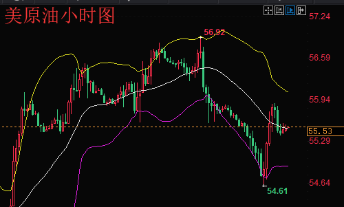 原油四小时线来看K线走势基本跟黄金一样经过昨日的深度回调,K线日内涨到56.92一线受阻,晚间冲高回落走空一度跌至下方54.5一线,短期来看MA5与MA10均线在56.28一线形成死叉后就持续性的下探走空,K线位于布林带中轨下滑布林带通规形成收袋趋势,MACD均线形成死叉后依然还是持续性的下探绿色能量柱持续放量。目前来看原油的空头趋势还是十分明显有劲,短期之内我们可先看至下方支撑点54.4一线。综合来看,今日短线操作思路上陈文龙个人建议以回调做多为主,反弹高空为辅,上方短期重点关注56.2-56.4一线阻力,下方短期重点关注54.6-54.8一线支撑。