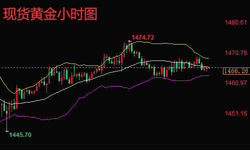现货黄金从4小时上看,金价暂守反弹之势,但MACD红色动能柱缩窄,KDJ随机指标温和走平,指示黄金短线反弹动能有所削弱,接下来或展开一段时间的小幅盘整。上周五回测确认布林道中轨受到支撑,短线反弹还在持续。轻微支撑启稳,配合美元弱势走跌。短线不排除进一步上扬反弹,至少目前的形态收盘情况还没有完全走弱,使得短线多空延续不定,日内短线暂时关注1462-1472之间,日内数据较少,所以今日短线操作思路上陈文龙个人建议以回调做多为主,反弹高空为辅,上方短期重点关注1473-1478一线阻力,下方短期重点关注1462-1457一线支撑。