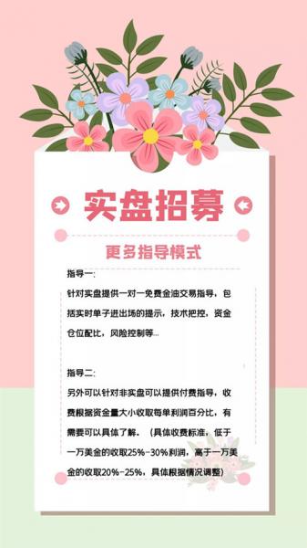 针对实盘提供一对一免费金油交易指导,包括实时单子进出场的提示,技术把控,资金仓位配比,风险控制等……有需要可以加入实盘指导。另外可以针对非实盘可以提供付费指导,收费根据资金量大小收取每单利润百分比,有需要可以具体了解。(具体收费标准,低于一万美金的收取25%-30%利润,高于一万美金的收取20%-25%,具体根据情况调整)