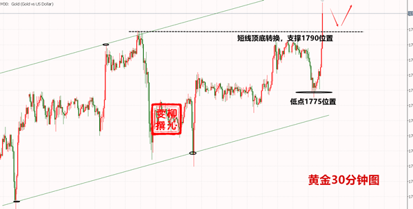 而第二单金价下破短线支撑位置到达1775附近反弹至76给到空单布局,到达下方为能够及时出局,晚间小损在1781附近;空单的出局意味着我们思路的转变,因此在1780反手多,到达1784附近先出。