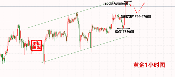 而第二单金价下破短线支撑位置到达1775附近反弹至76给到空单布局,到达下方为能够及时出局,晚间小损在1781附近;空单的出局意味着我们思路的转变,因此在1780反手多,到达1784附近先出。