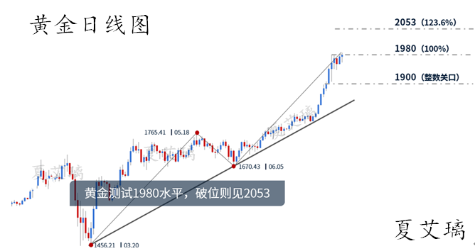 7月黄金收于1970美元关口上方,当月累涨10.91%。前半月的行情平淡如水,但后半月紧张刺激,现货黄金斩获9连阳,从1800下方飙升近200美元,最高触及1982美元水平。COMEX期金则两次上触2000美元大关。