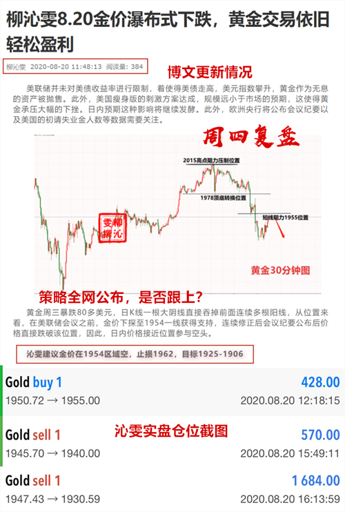 周四目前交易3单,午间在1950附近去博取短线多单利润,到达1955小获利出;第二单按照我们思路跟进空,在1945先行布局,在1947再次加仓空,金价如预期下跌先在1940附近先出部分,最终到达1930给到最终利出点位。