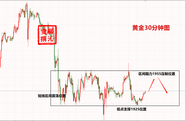目前时间来到美盘,金价一直盘整于1921-1930之间。下方坚挺的支撑是1921,日内已经两次触及反弹,如果今天晚间还是不能破位该点位,那么明天可能还会先反弹再走低。如果说今天破位1930,那么黄金有可能不会到我们周初说的高点1960上方开始下跌,下跌有可能会提前到来。
