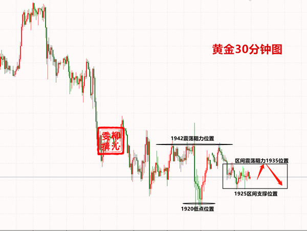 从短线黄金图可以清楚看到1942是压力平台,白盘有反弹的机会靠近做空,更强的压力是1948-1950,下方的支撑平台是1920一带,更强的支撑带在1910,一旦1910被跌破将会开启新的大跌空间,而且后期会带来深度调整。