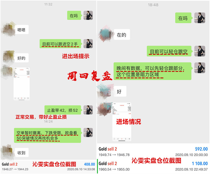 周四交易了三单,依旧是思路先行。今日早间先在1946的空单,在1944小利出。而午后金价破位阻力位置上涨,不着急去追多,冲高至1949选择了布局空单,最终在1946小利出;最后一单金价在高点1960位置受阻回落再次去布局空,到达目标位置1955获利出局!