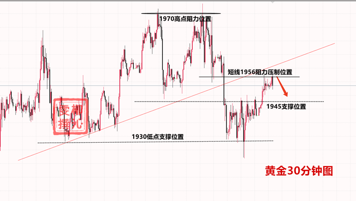 因此今日操作以1960-1930为为区间高沽低渣即可,需要注意的是空为主多为辅,整体上金价向下突破的几率还是较大的!因此建议1955-1960区域空,止损1968,目标1940,目标1940-1935!