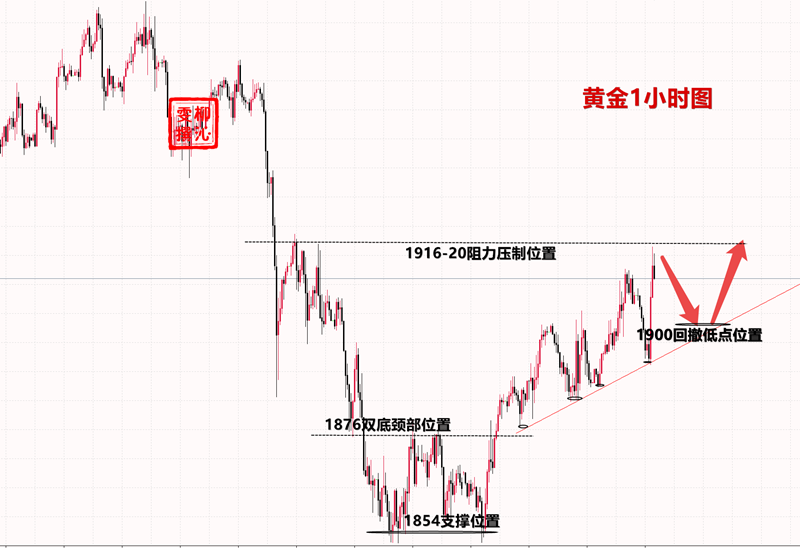 昨天我们讲到了下方1880在昨天多次测试之后都不能跌破,建议大家按1小时级别的上行趋势线,继续顺势看涨做多。第一目标1900和第二目标1910都顺利到达,虽然1920极限位没到,但总要给非农留点波动空间。