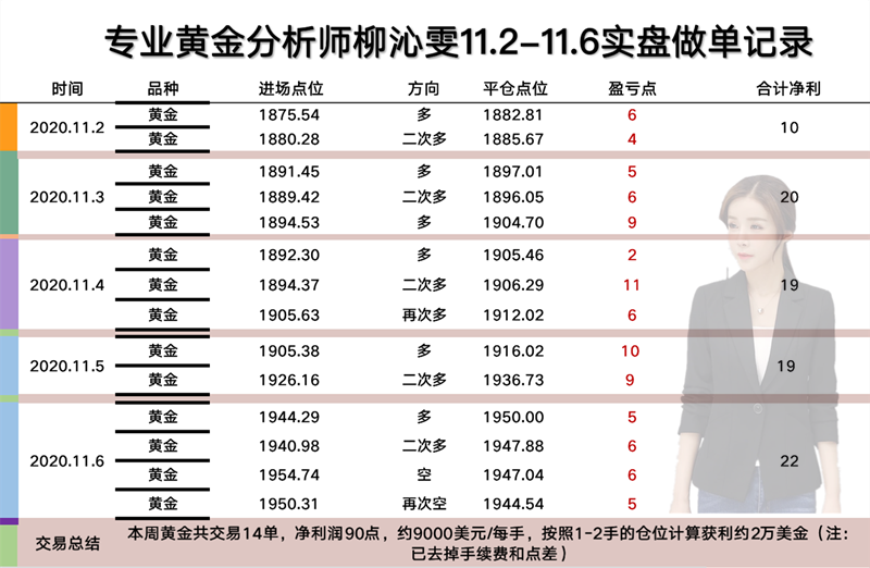 上周沁雯总计交易11单,净利90点。就上周交易来说,比较好的就是大家都有严格按照我们当日的交易计划去进行操作,并且行情大多也在沁雯的预期之中,就拿周五收割的22美金说,当日大家的感觉是行情是“疯了”吧,但是现在再回过头去仔细看看的话,其实黄金还是没能逃脱1926低点支撑的魔掌,那么我们要做的就就是把握好进出场点位,在进去的时候,你要找到说服自己的了理由,找到进场的一句和理由,这样到后面你才不会后悔。