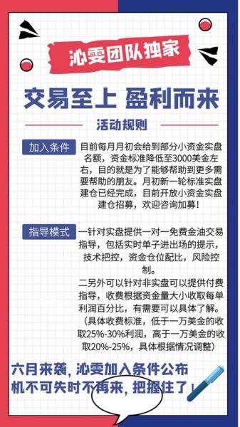 针对实盘提供一对一免费金油交易指导,包括实时单子进出场的提示,技术把控,资金仓位配比,风险控制等……有需要可以加入实盘指导。另外可以针对非实盘可以提供付费指导,收费根据资金量大小收取每单利润百分比,有需要可以具体了解。(具体收费标准,低于一万美金的收取25%-30%利润,高于一万美金的收取20%-25%,具体根据情况调整)
