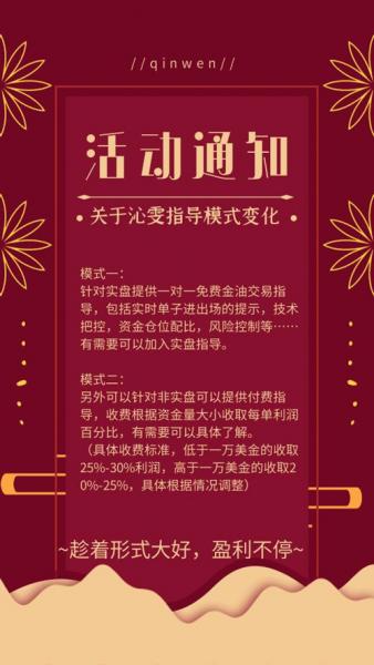针对实盘提供一对一免费金油交易指导,包括实时单子进出场的提示,技术把控,资金仓位配比,风险控制等……有需要可以加入实盘指导。另外可以针对非实盘可以提供付费指导,收费根据资金量大小收取每单利润百分比,有需要可以具体了解。(具体收费标准,低于一万美金的收取25%-30%利润,高于一万美金的收取20%-25%,具体根据情况调整)