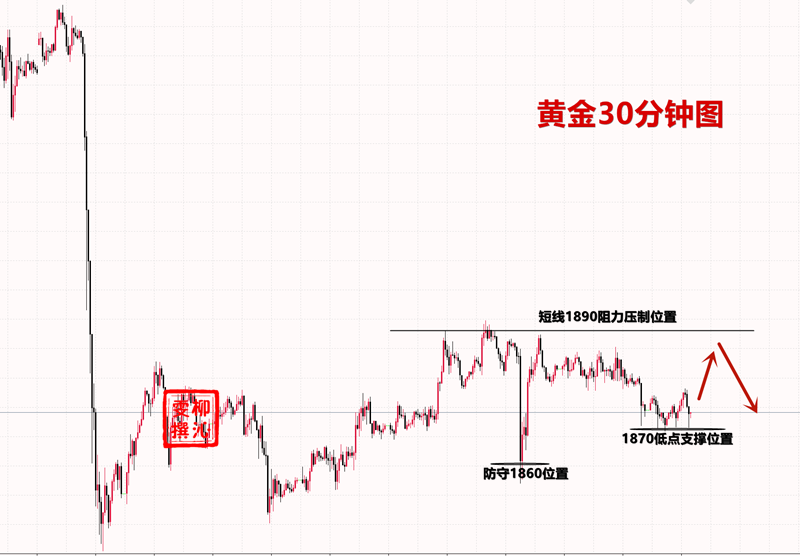 结构上,小周期30分钟图RSI指标出现底背离,macd指标快慢线金叉,短线跌势暂缓.4小时级别K线走出明显的底分型形态,所以今天操作上,上面空单已经成功拿下利润,那么晚间建议依托低点1875-76附近接多,防守1小时上升趋势线下方,目标看1898-1890。