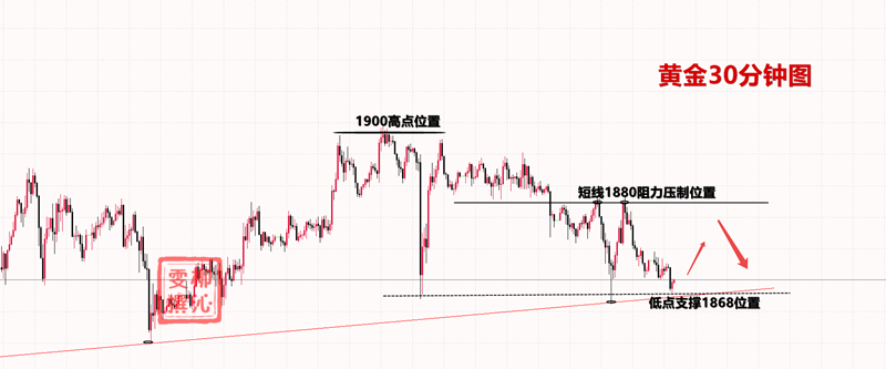 后半夜黄金回落,早间虽然没有直接反弹,但是在低位一直震荡,昨天美盘止跌反转的分界点1868没有跌破,那么今天亚盘黄金还是要先看一波反弹,短线以1868为支撑看涨,上方回看1880附近即可,欧美盘再去确定高点做空,本周最后两个交易日的主要思路就是高位空。