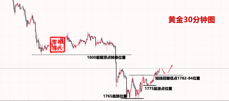 从盘面上看,K线走出深V反转形态,连续突破1800,以及上周暴跌起始点1807。毫无疑问,金价已从空头开始转多。后续操作就只有一个方向,就是回落多。