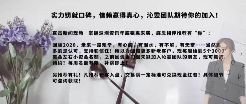 回顾2020,走来一路艰辛,有心酸,有泪水,有不解,有无奈……当然更多的是认可,支持和信任!所以为回馈更多新老客户,现每周给到5个3000美金左右小资金名额,之前因资金门槛未能加入沁雯团队的朋友,现可抓紧预约!每周名额有限,补满即止!