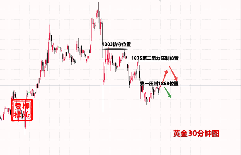 今日行情和昨日的走势非常类似,都是白盘探底之后小幅走高,然后在欧盘时段二次探底下行,昨天最低跌到1866开始反弹走高,美盘一路慢阳至1881就是早盘高点附近,而今日也走出了和昨天差不多的走势。