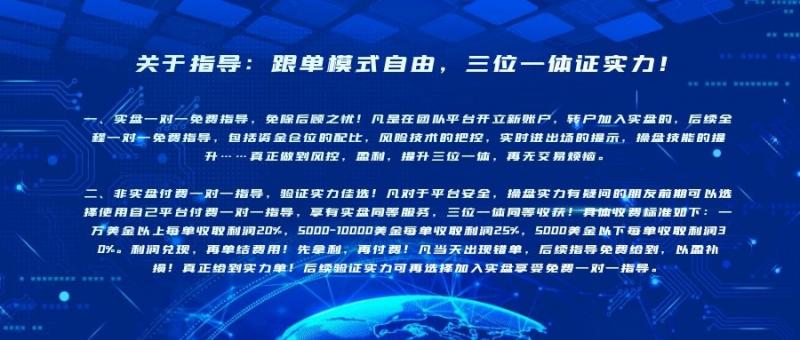 二、非实盘付费一对一指导,验证实力佳选!凡对于平台安全,操盘实力有疑问的朋友前期可以选择使用自己平台付费一对一指导,享有实盘同等服务,三位一体同等收获!具体收费标准如下:一万美金以上每单收取利润20%,5000-10000美金每单收取利润25%,5000美金以下每单收取利润30%。利润兑现,再单结费用!先拿利,再付费!凡当天出现错单,后续指导免费给到,以盈补损!真正给到实力单!后续验证实力可再选择加入实盘享受免费一对一指导。