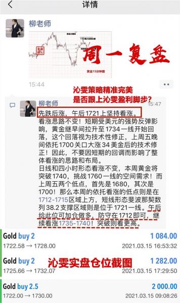 周一交易喜迎开门红,策略精准完美!今日提到的下方在1720附近短线支撑成功企稳,因此到达1722附近给到多单的进场,到达1725继续加仓多,最终部分仓位先在1728附近利出,剩余仓位止盈设置在了1732附近,舒服了。