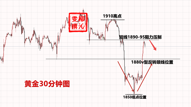 黄金周四的急跌也见顶信号,但周五的急涨又让行情陷入区间横盘整理之中。行情在急跌急涨后,大概率会先震荡横盘运行。目前短线从1916进行的下跌,形成的空头趋势阻力在1900位置,该位置不破,周初先看短线下跌,目标看1875、1855。