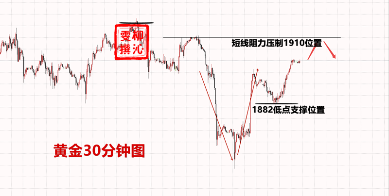 欧盘最低跌至1881一线后冲高1888一线,但是冲高受阻,被4小时中轨硬生生拦住,止住涨势,黄金依旧看空,50均线向下倾斜角度增加,黄金下方目标1870位置,黄金在未破1900之前,我们做空进场就是数钱的节奏,简直送钱的行情,不用多思考犹豫,大胆进就可以了,黄金在没有大的消息面刺激很难再次突破1900一线,反弹是给进场的机会。