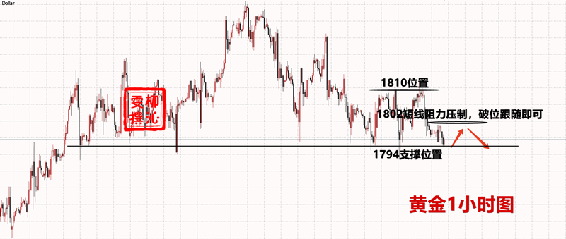 今日上方重点关注的点位在1802这里,1802是昨晚美盘首次跌破1800后反弹的高点,所以如果今天收盘继续维持1802下方,甚至是1800,那么接下来下跌破位的风险将会被放大。1802是今日多空分割点,一旦说今日站稳1802上方,那么黄金就有概率朝向1810昨日高点去,甚至是W顶部位置1825附近去。