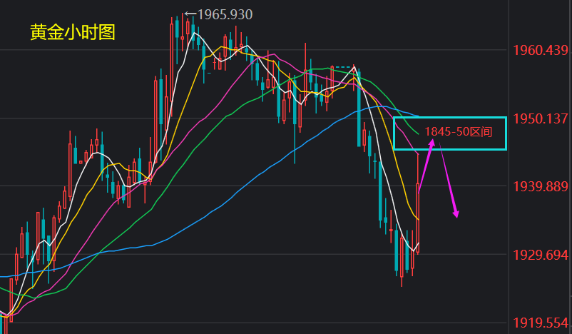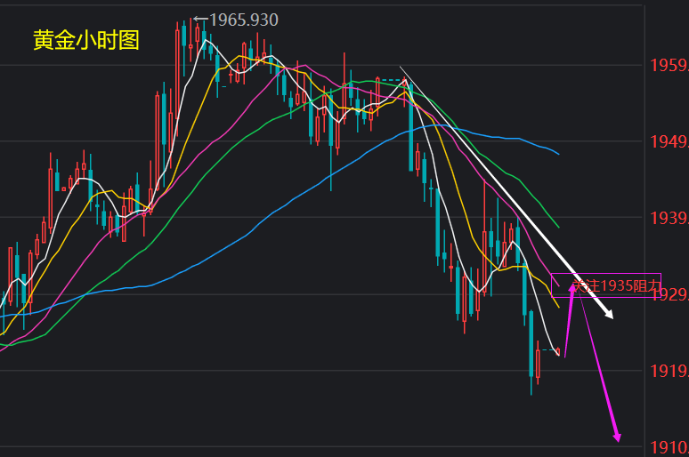 黄金走势分析: 日内黄金自早间开盘即出现下跌调整,且是不间断的下跌趋势,至欧盘时段低点跌至通道下沿支撑1925一线,导致日内黄金持续下跌,市场情绪异常一边倒的主因还是俄乌将进行新一轮谈判的影响,即市场对俄乌谈判抱有预期,使得避险情绪降温。以目前日线以及小时图运行情况来看,日内走势虽然偏激异常,
