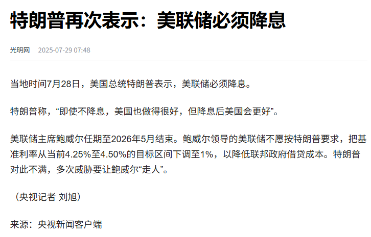 上周末,特朗普又宣布对欧盟跟墨西哥加征30%关税,截止到目前,对外加税的国家多达34个,这一数字有可能还会上升。 关税所带来的贸易不确定性加剧,催生黄金市场的避险买入。 而比关税影响更意外更重磅的事件,当属市场传闻的美联储主席将要辞职。 近期,特朗普多次公开喊话要求美联储降息,