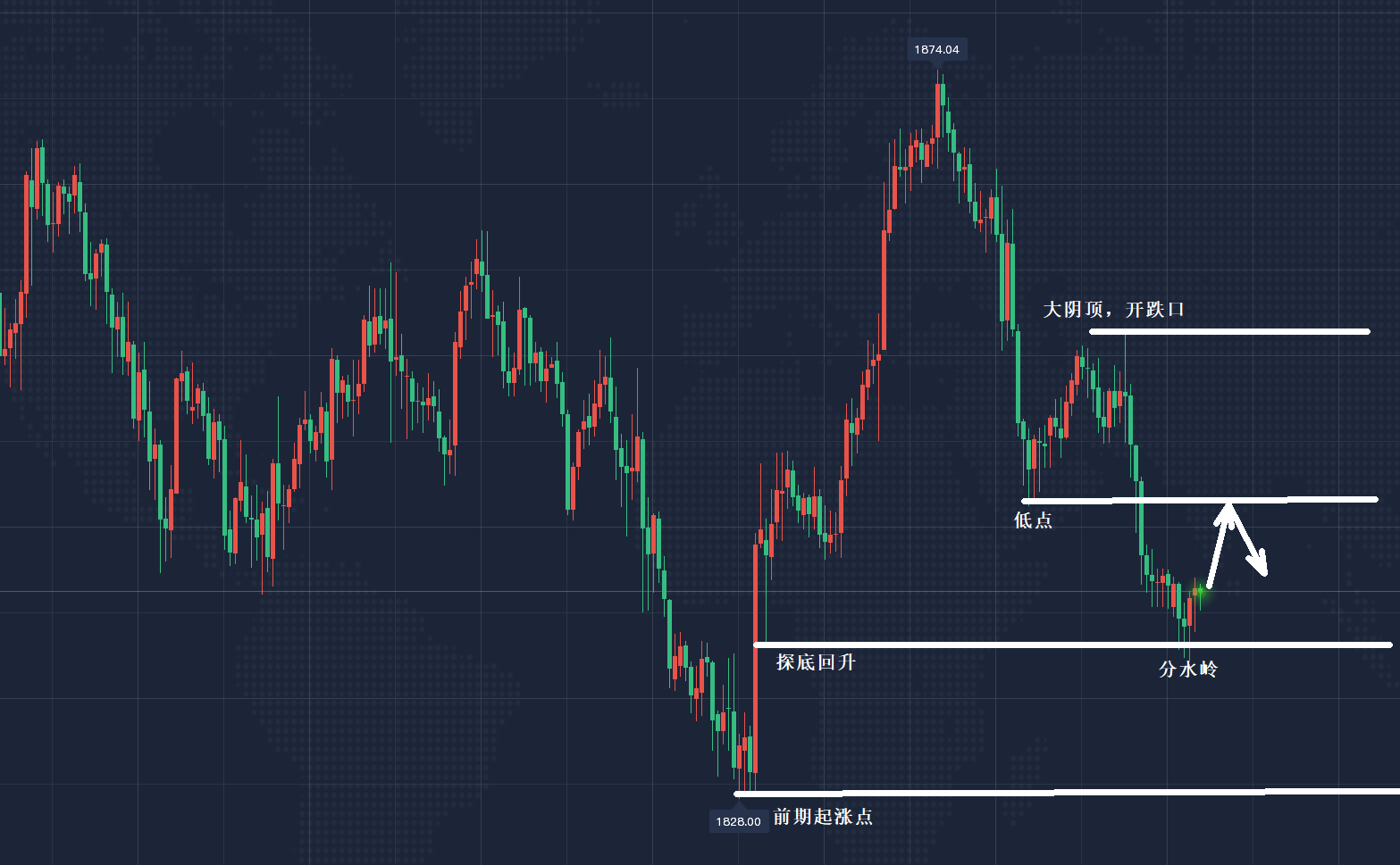 而早间续跌的走势,分水岭早间开跌口,看续跌,欧盘很关键,不能破高,破高了震荡。