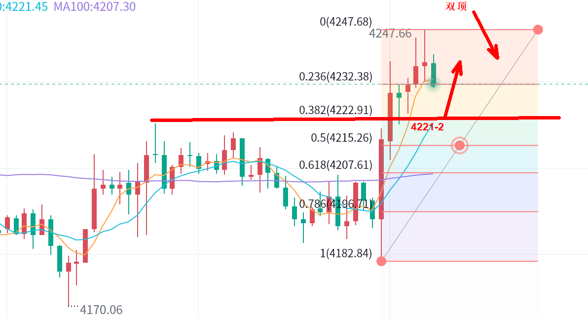 而这中间还有一个关键点:4221一线,顶底转换位,也是凌晨续涨低点位,同时是昨日上升回撤382位置,是一个极度关键的点。