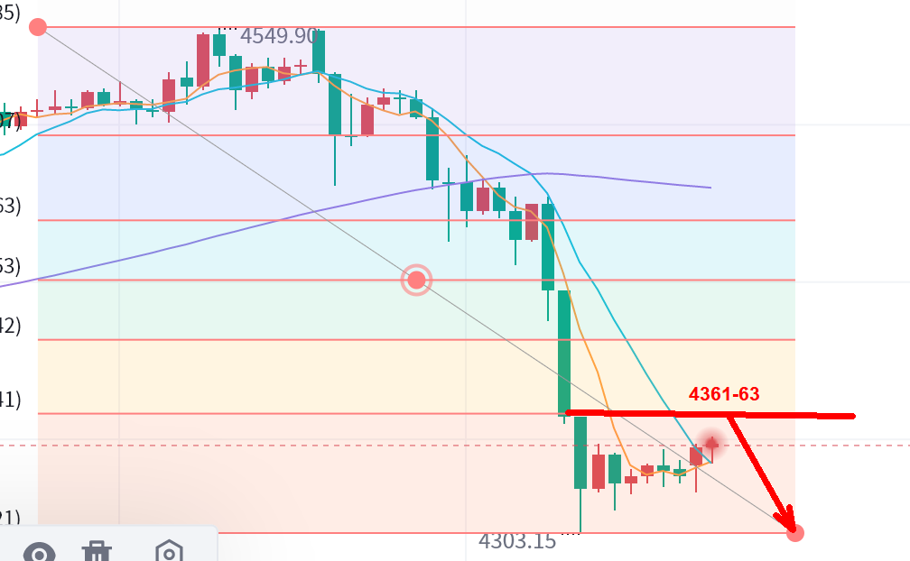 3,一直强调的382位置,前一日下跌,欧盘上升,6-8点冲高,那么美盘是不是冲高空,而382位置在4398-4400关口,日内不看这个位置是点位太高,而晚间到4380上方, 看阻力,就是前一日下跌反抽382位置。