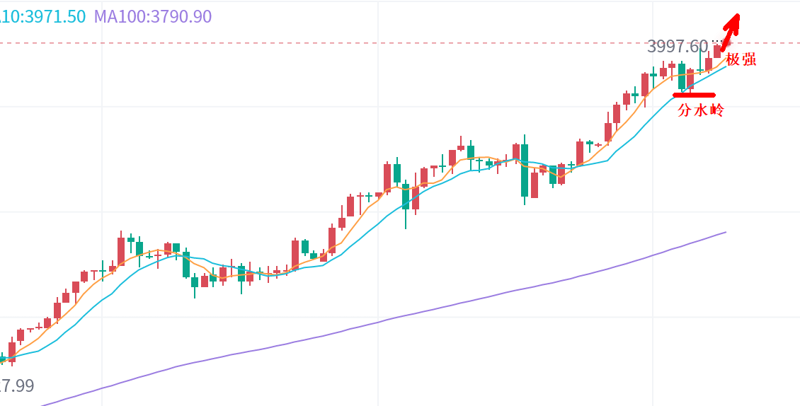 这样走,4000美金也只是咫尺的事。 上一周波动了100多美金,2个交易日而已。 而今日早间行情就波动了50美金,丝毫没有滞涨的形态,那么离4000美金也就70个点,两天的事。 这一波技术性上升,可以说是最大的牛市,连低头吃草都不缓和,一直是直线拉升。 这就意味着丝毫都空缓不过气