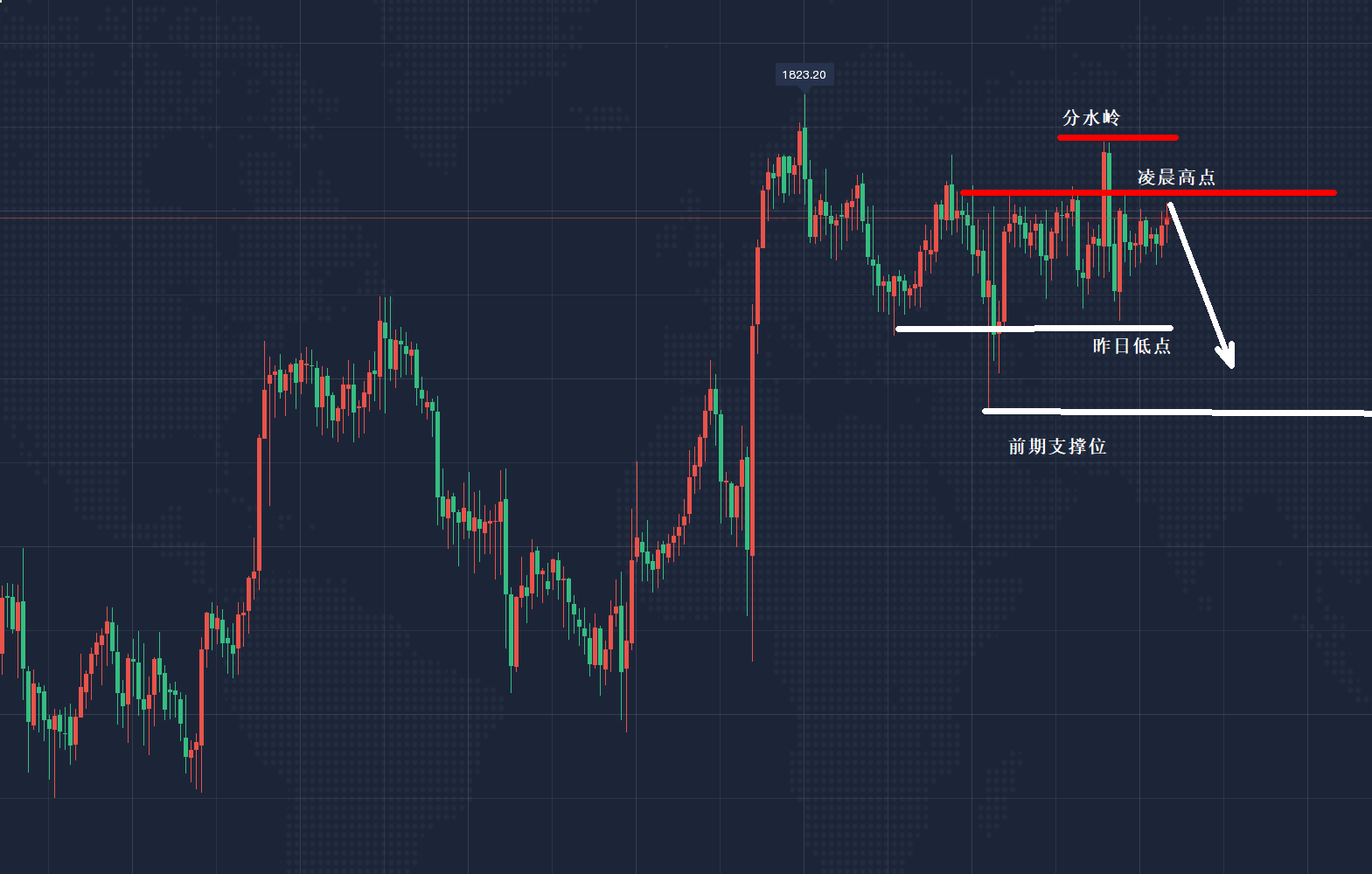 今日不在讲更多的故事,而是直接来讲讲技术形态。 首先,我们把昨日行情拆开,看看昨日的形态。 1,在震荡行情中,一定要区分判断强弱是转折点:时间和分水岭。 通常时间就是指欧盘,欧盘的强弱,关系到突破的方向,其次是高低点位置,跌破或者突破,都是代表未来的方向。 所以,当昨日早间上升,欧盘前跌破早间起涨点,