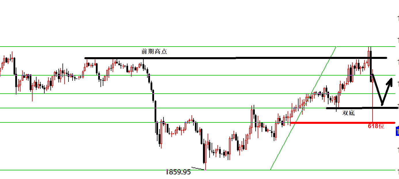 黄金市场来说,昨日早间快速探底后,价格基本围绕区间运行,日线报收于大十字K,价格依然收盘在短期均线之上。 那么我们来看下昨日出现的几个技术点: 昨日可谓被618霸占了整个技术走势: 1,1882一线,这是1865-1915上升回撤的618位置,第一次触及快速反弹,第二次继续测试反弹。 2,1903一线,这是1916-18