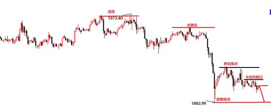 一日中,定势非常关键,而判断势主要还是从前一日的形态入手。 昨日虽然强调黄金谨防回撤,但完全没想到回撤的力度如此之大,特别是美盘,做了续跌,但价格却破了1900一线,整日跌幅达70美金之多。 从当前的走势来说,日线的跌幅足够大,但却没有破上一次的低点。 同时,收盘的形态也很关键,并不是极弱收盘,