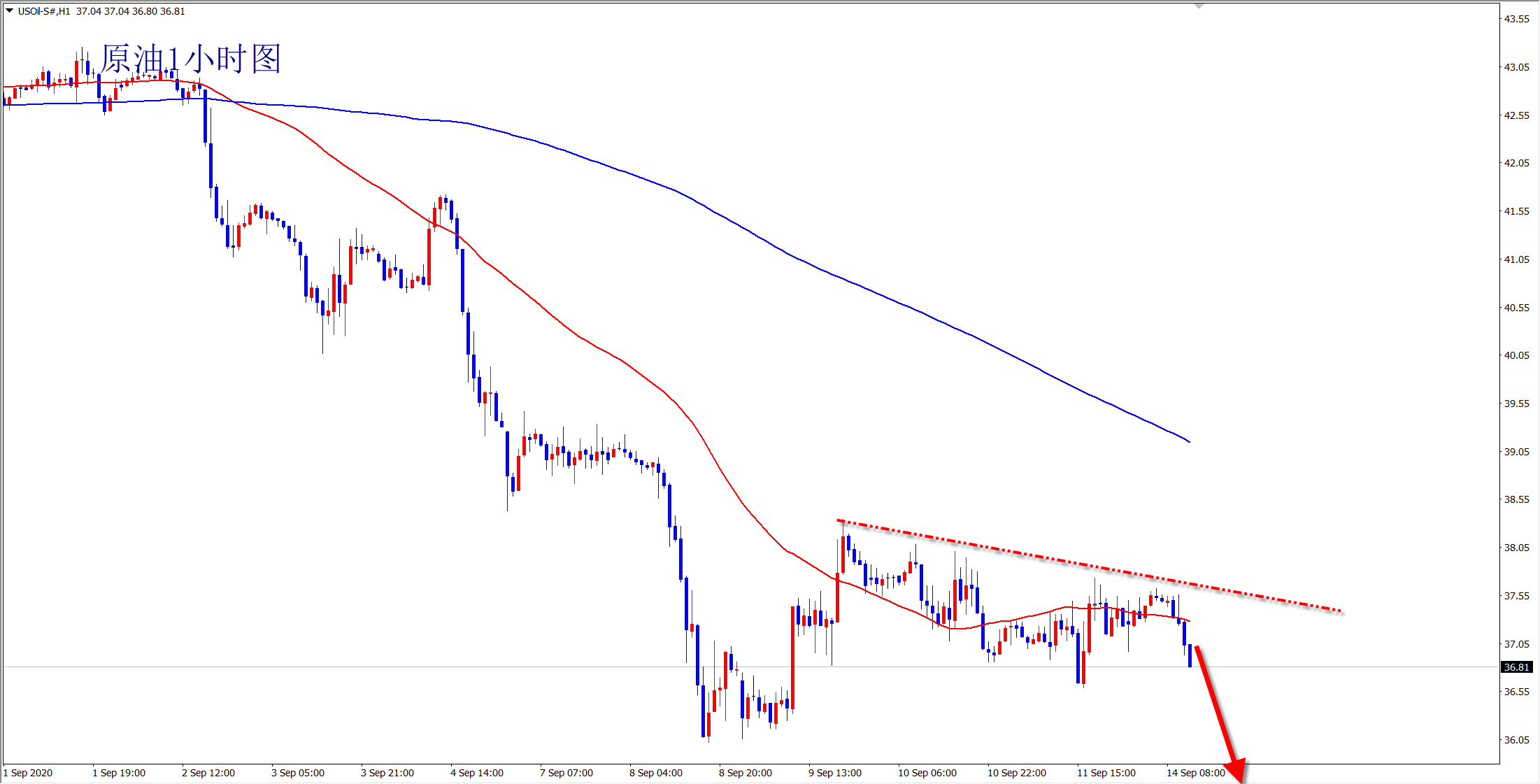 对于原油的走势已经提示N多遍了,此前盘整状态时,我们一直观望,因为实在没有可以操作的空间,每日费力不讨好!但是原油破位,方向明确后,我们便果断放手干空,疾如风,猛如虎!每天对于原油的策略就是高位空,从41.5位置空开始,到今日37.4位置继续空,接下来还是空不变!