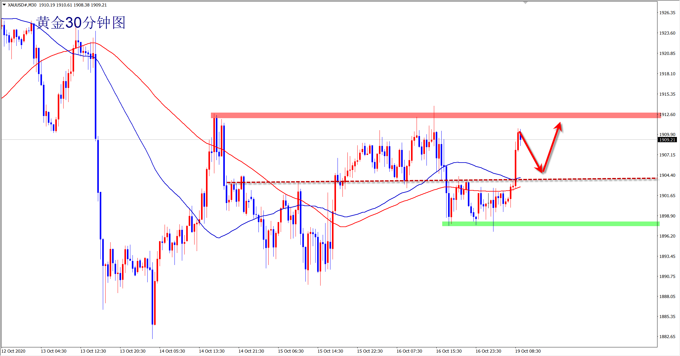 美盘黄金1905附近接多,防守1898即可,等待二次拉升突破!