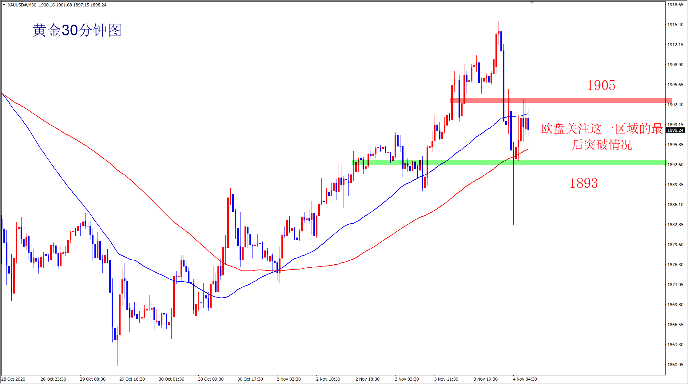 短线来说,由于预期拜登当选落空的影响,黄金会出现短线的下跌,甚至有可能跌至1860下方,但是长期来看,黄金避险需求下仍有继续新高的可能。对于今日的操作来说,接下来关注的是1895位置的得失,如果结果证实川普当选,并且跌破1895的情况下,顺势干空即可,会是大跌的走势!但如果结果后黄金依然坚挺,维持当前的反弹上涨趋势的情况下,我们还是维持此前的策略,继续低多!