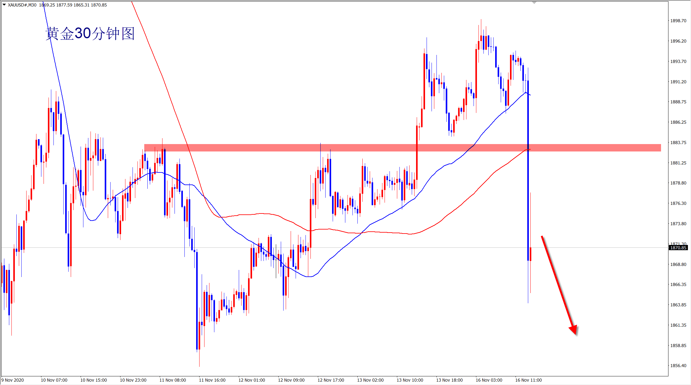 又是疫苗!同样的戏码再次重复,黄金继续直线下跌!黄金已经转空,接下来空为主,美盘依托1883压力干空!