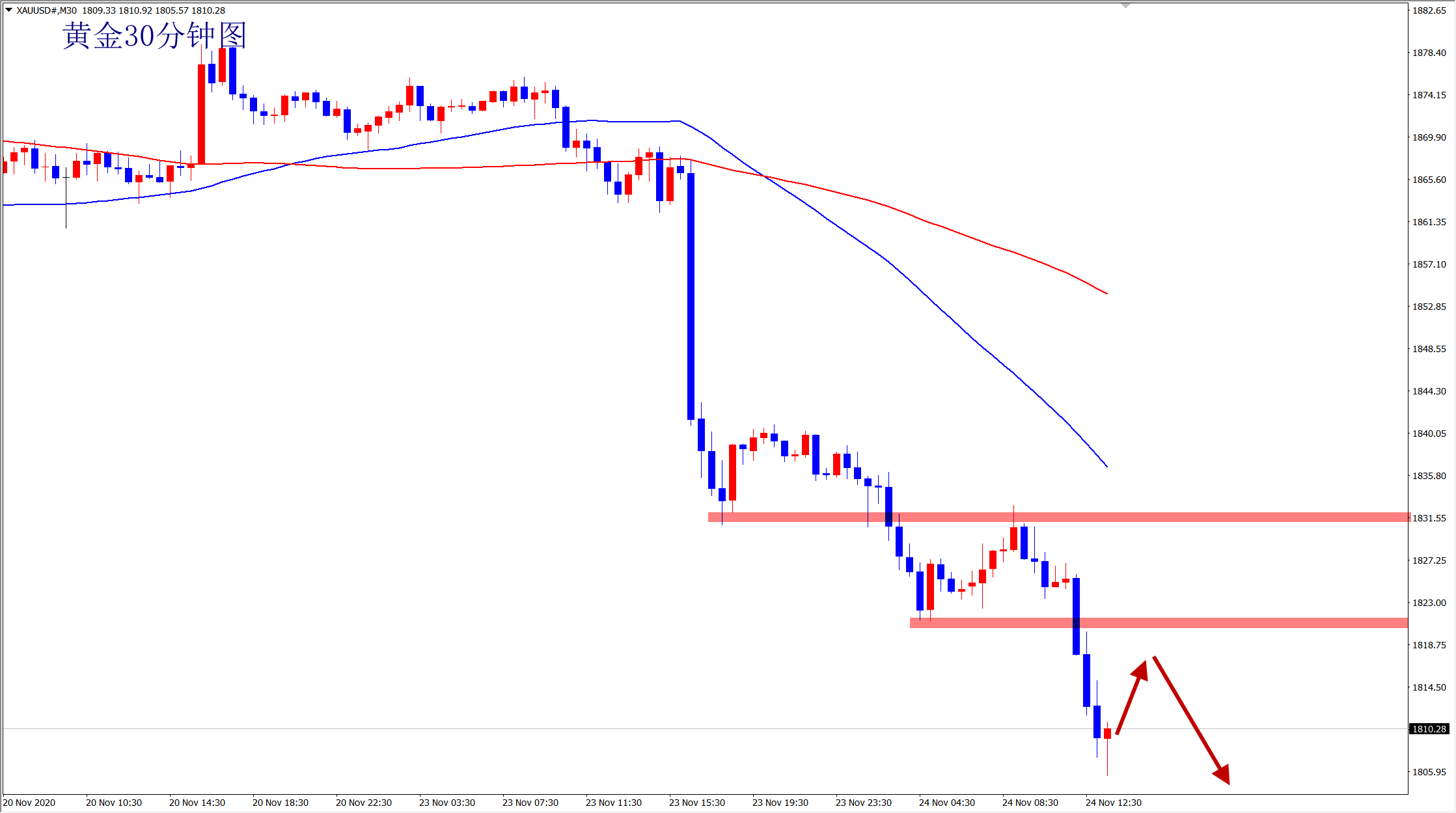 黄金今日再次延续跌势,并且未有见底转折迹象,在这里还是奉告多头抄底者,千万不要逆势多,美盘反弹还是顺势空,反弹1815附近或者上方即可进场直接空!今日行情大概率破位1800!