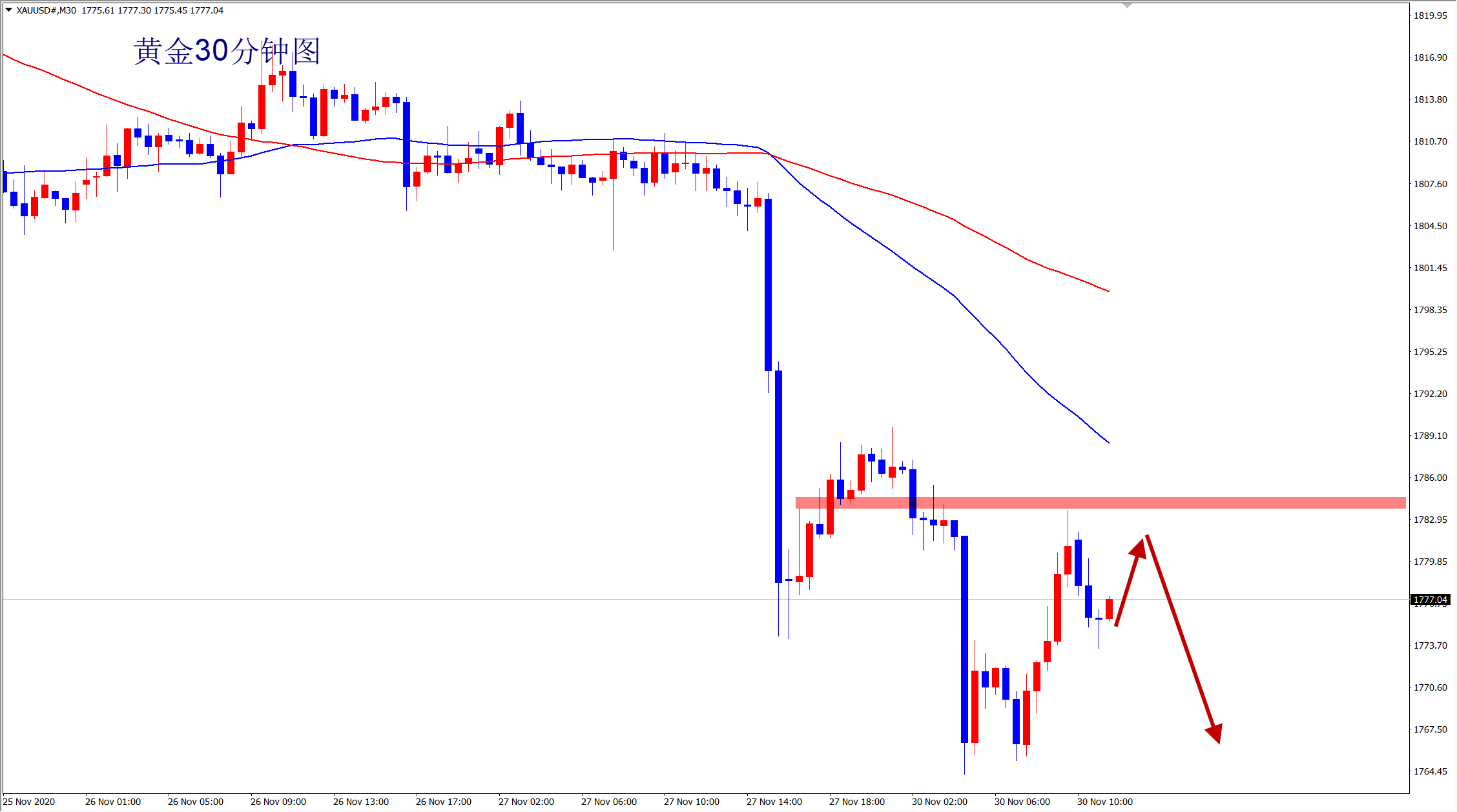 黄金明显的跌势,有反弹,不否认!反弹绝非反转!甚至是再次下跌的开始!黄金早盘在1765位置获得支撑,反弹遇阻1783!美盘突破不了1785的压力,必然会再次下跌,破位新低!